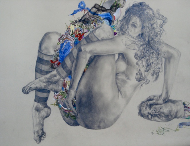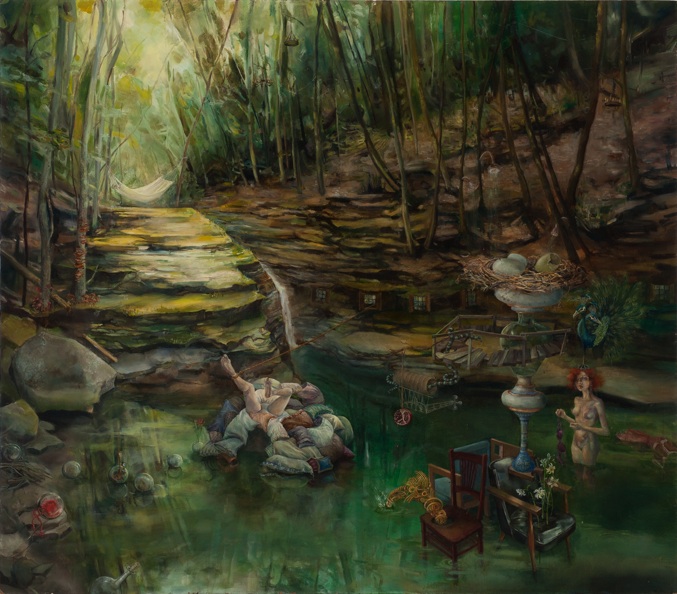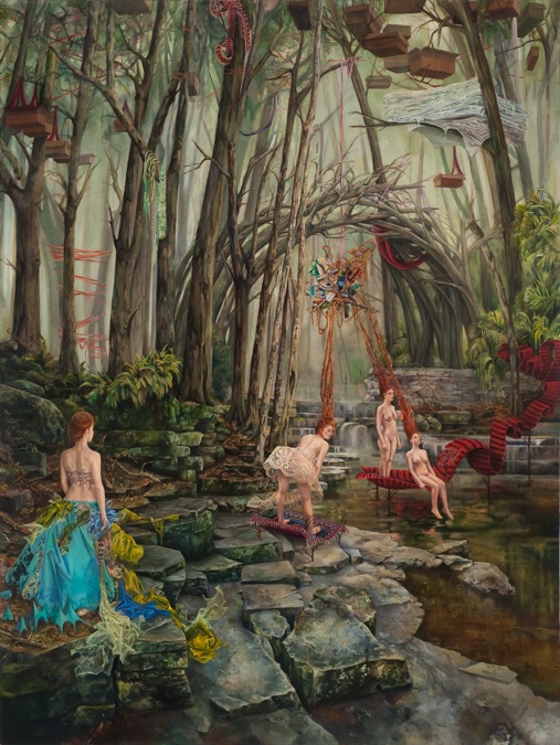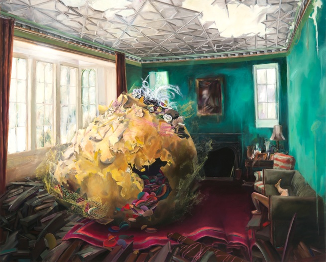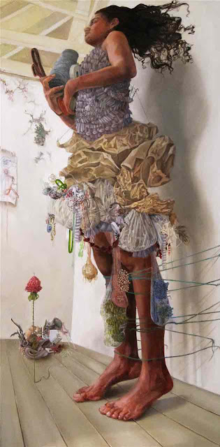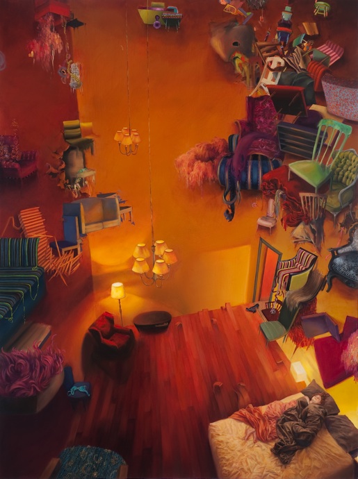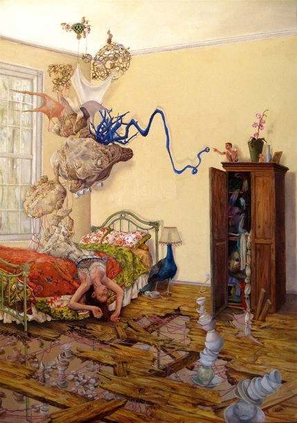 Ali Miller de Long Island, Nueva York y actualmente se encuentra cursando su maestría en la pintura en la Escuela de Maryland Institute of Art de Baltimore. Ella está feliz de estar rodeado de un grupo tan ecléctico de artistas talentosos.BFA de Alfred University, en 2008, y actualmente está trabajando en un MFA en Maryland Institute College of Art de Baltimore. Tengo una necesidad de dirigir la Misen escena de la espacios que habitan. En la pintura, soy capaz de mirar hacia abajo en mi realidad, y organizar cuidadosamente la ubicación de los objetos, los colores y los adornos de las escenas. Me inyecto mi fantasía ideal en lo real, a su vez, se entrelazan y, a veces confundir los dos. mi trabajo, una vez arraigada en la construcción de espacios como escondites, o se escapa de la realidad, se ha desarrollado a través de mi intento de mejorar la realidad, de forma que se ajuste a mi sueño de la versión. Como resultado, a menudo construir esculturas físico a utilizar referencias como para perder mi visión de lo ideal. Estas esculturas nacen de los restos reales de mi vida:. Telas, encajes, hilo de colores brillantes, los bits de accesorios rotos enredado alrededor de mi representaciones de la escultura real, táctil, pinto las reliquias de mi fantasía: una fantasía informados por extravagantes artistas pop, para sentirse bien momentos de comedia romántica, vestuario de teatro elaborada, y las escenas artificiales de videos musicales. Mi tendencia a exagerar la realidad, a pensar en los extremos, se manifiesta en los colores saturados y las representaciones teatrales de un mundo fantástico. predilección por el control se materializa en texturas laborioso, patrones, diseños en miniatura y los detalles fastidiosos, todos ejecutados con pinceles pequeños. Encuentro consuelo en las minucias de mi trabajo y la tensión al pintar trazos gruesos con grandes pinceles. La satisfacción que viene con las figuras de representación de una impresión de realismo es interrumpido por mis intentos de técnica liberal y los momentos menos fórmulas en la pintura. El cierre se me escapa ya que trabajo para perfeccionar las formas ideales, mientras que mi realidad se deshace de mí en el caos que tratan de contener con una cuerda. Los riesgos son altos y las repercusiones de dejar que el derrame del caos de mi pintura no controlados son catastróficas. El resultado de mi proceso es un espacio más elaborado y más bella que la que me habitan: es a la vez el escenario de expectativas fantásticas de mi vida y el espacio contemplativo para la comprensión de mi decepción con lo real y su relación con lo imaginado.